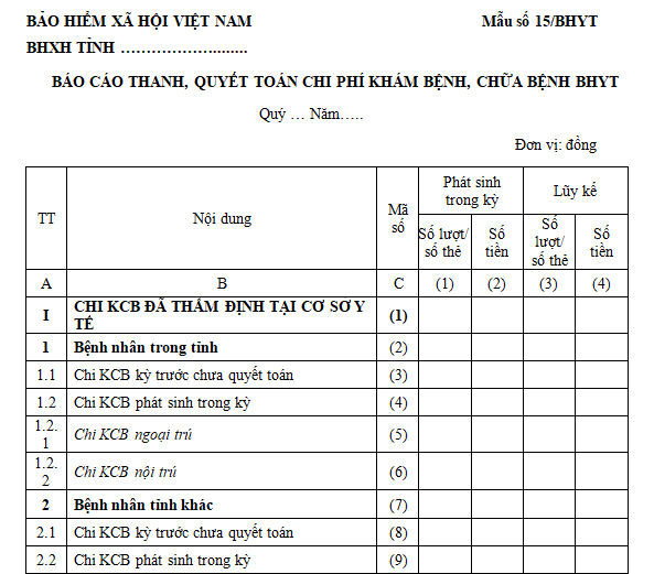 Mẫu số 15/BHYT: Báo cáo thanh, quyết toán chi phí khám, chữa bệnh BHYT là mẫu bản báo cáo được lập ra để báo cáo về việc thanh, quyết toán chi phí khám và chữa bệnh bảo hiểm y tế. Mẫu báo cáo nêu rõ thông tin thời gian báo cáo, nội dung thanh, quyết toán...